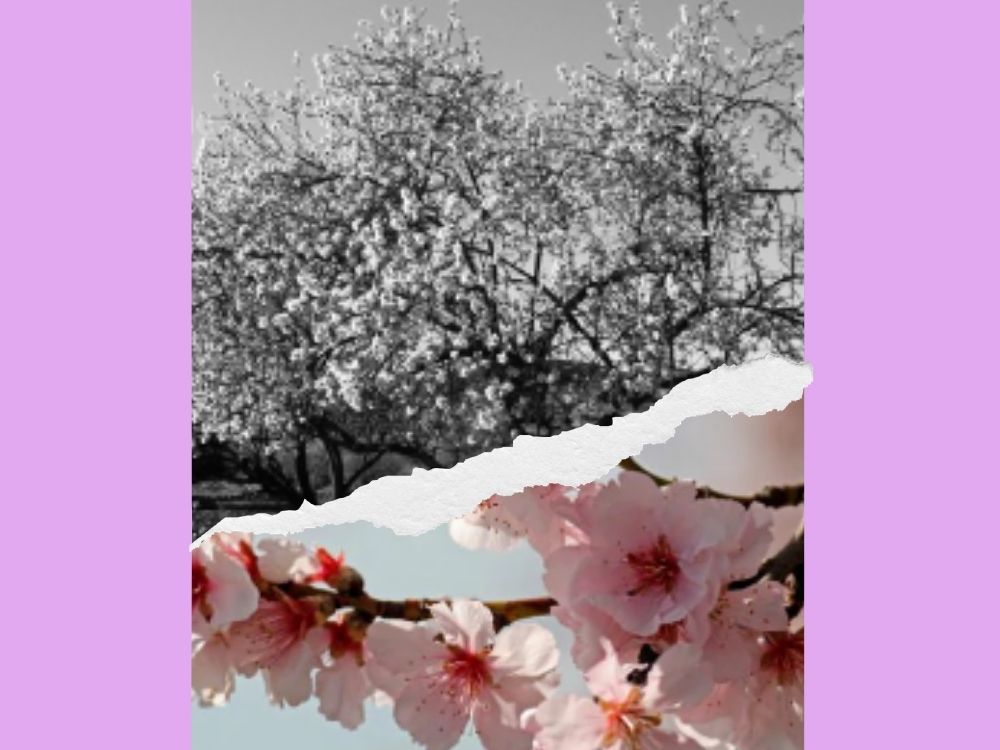 The sweet almond tree is medium in height with bark that may appear reddish, bluish-green, or brown. It is commonly cultivated in orchards and gardens.